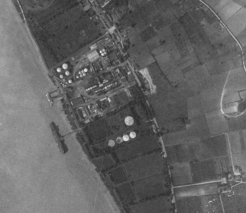 Dans l’après-guerre, le site est uniquement dédié au stockage, au transport et à la distribution de produits pétroliers. Une vue aérienne de juin 1950 montre les citernes en place, le château d’eau construit, et un nouvel atelier de fabrication, à structure de béton armé de type Hennebique, en cours de construction.