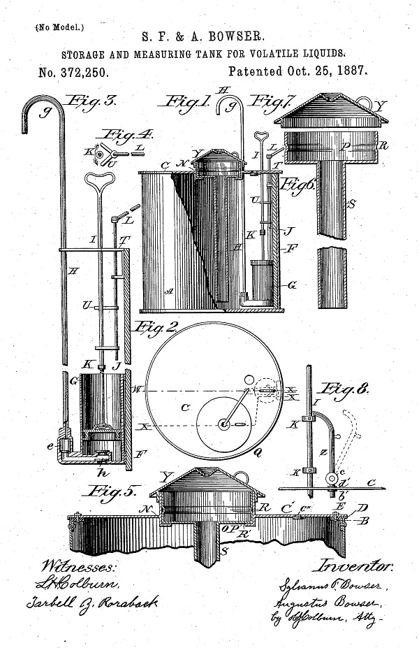 Le 5 septembre 1885, SF (Sylvanus Freelove) Bowser (Fort Wayne) vendit, à Jake Gumper propriétaire d’une épicerie à Fort Wayne (dans l’Indiana), sa nouvelle pompe à bras, pour le kérosène.