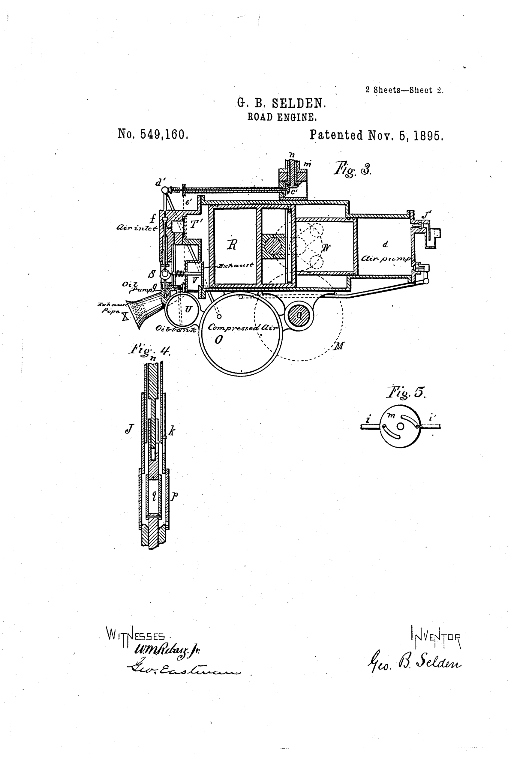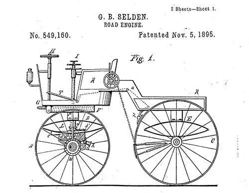 George B Selden, avocat en brevets et inventeur de Rochester (dans l’État de New York), s’est vu accorder un brevet américain ( n° 549 160 ) à la fin de 1895 pour un « engin routier perfectionné » fonctionnant grâce à un « moteur à hydrocarbures liquides de type compression ».