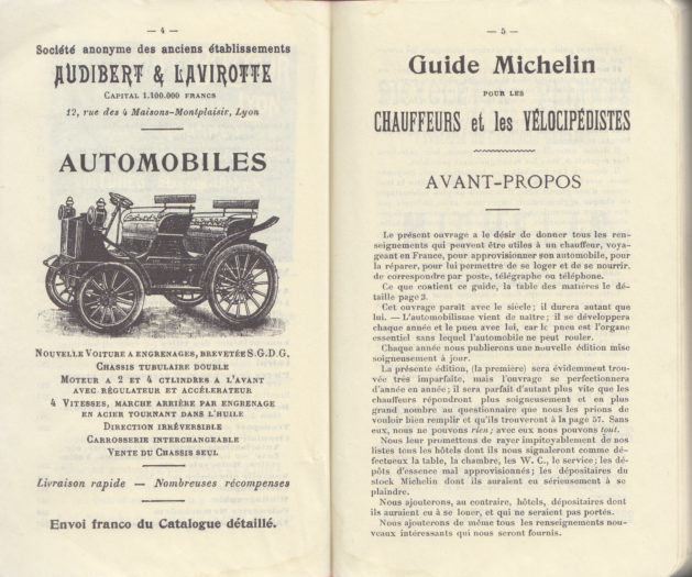 Tiré à 35 000 exemplaires, « offert gracieusement aux chauffeurs » avec l’achat de pneumatiques, le Guide Michelin illustre le pari visionnaire des frères Michelin : miser sur le développement de l’automobile, et donc favoriser celui du groupe, en améliorant la mobilité des automobilistes.