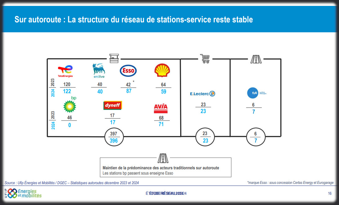 En 2024, l’UFIP, dans sont raport « ÉTUDE RÉSEAU 2024 VENTES DE CARBURANTS ET RÉSEAU DE DISTRIBUTION », nous présente la structure du réseau. Il ne reste plus que l’enseigne de GMS E.LECLERC.