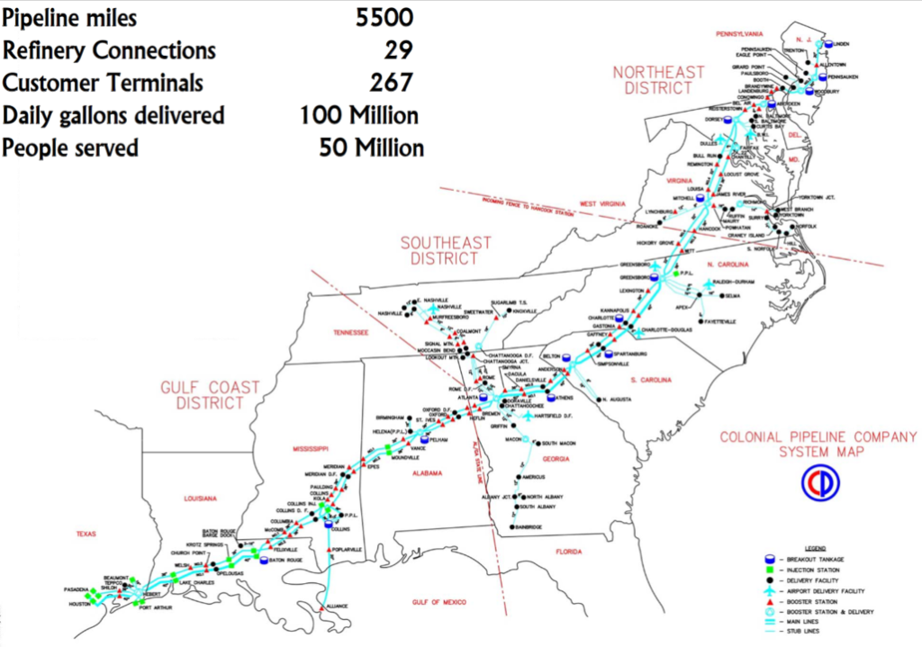 Colonial Pipeline est est un réseau d’oléoducs d’environ 5 500 miles (près de 8 850 km) de produits pétroliers, notamment de l’essence, du gazole, du fioul et du kérosène, depuis les raffineries de la côte du Golfe du Mexique jusqu’au nord-est des États-Unis, incluant la région de New York.