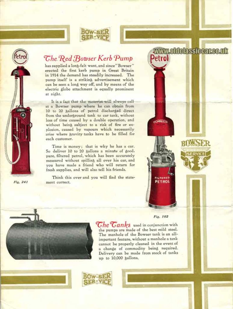 « En ces temps de compétition, tout garagiste doit s’efforcer d’offrir un véritable service au propriétaire d’automobile ; celui qui obtient chaque jour de nouveaux clients ne peut le faire qu’en gagnant leur CONFIANCE. Sans cette confiance, il y a toujours une suspicion injustifiée concernant la réputation du vendeur, et cela prive l’acheteur de ressentir cette confiance si importante au métier de garagiste. La marque Bowser apposée sur les pompes à piston est gage de confiance et de qualité du service. Ce label de qualité nous permet aujourd’hui d’occuper la première place dans le monde. En tant que détenteurs des premiers brevets et pionniers de la pompe à piston, nous avons été les premiers à introduire ce système en Grande-Bretagne, en Inde, en Australie, en Nouvelle-Zélande, en Afrique du Sud, en fait, le soleil ne se couche jamais sur les produits Bowser.