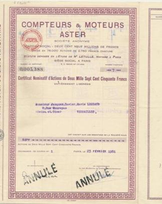 La Société des Compteurs et Moteurs ASTER, plus connue sous le nom d’Aster, dont le siège social était à Paris (rue du Général Foy dans les années 50), fut créée sous le nom « L’ASTER » le 26 septembre 1898. Elle avait “pour objet la construction, le commerce, l’exploitation de tous appareils mécaniques, électriques ou autres, et généralement toutes opérations se rattachant à ces diverses exploitations.” (Acte de constitution du 26 septembre 1898)