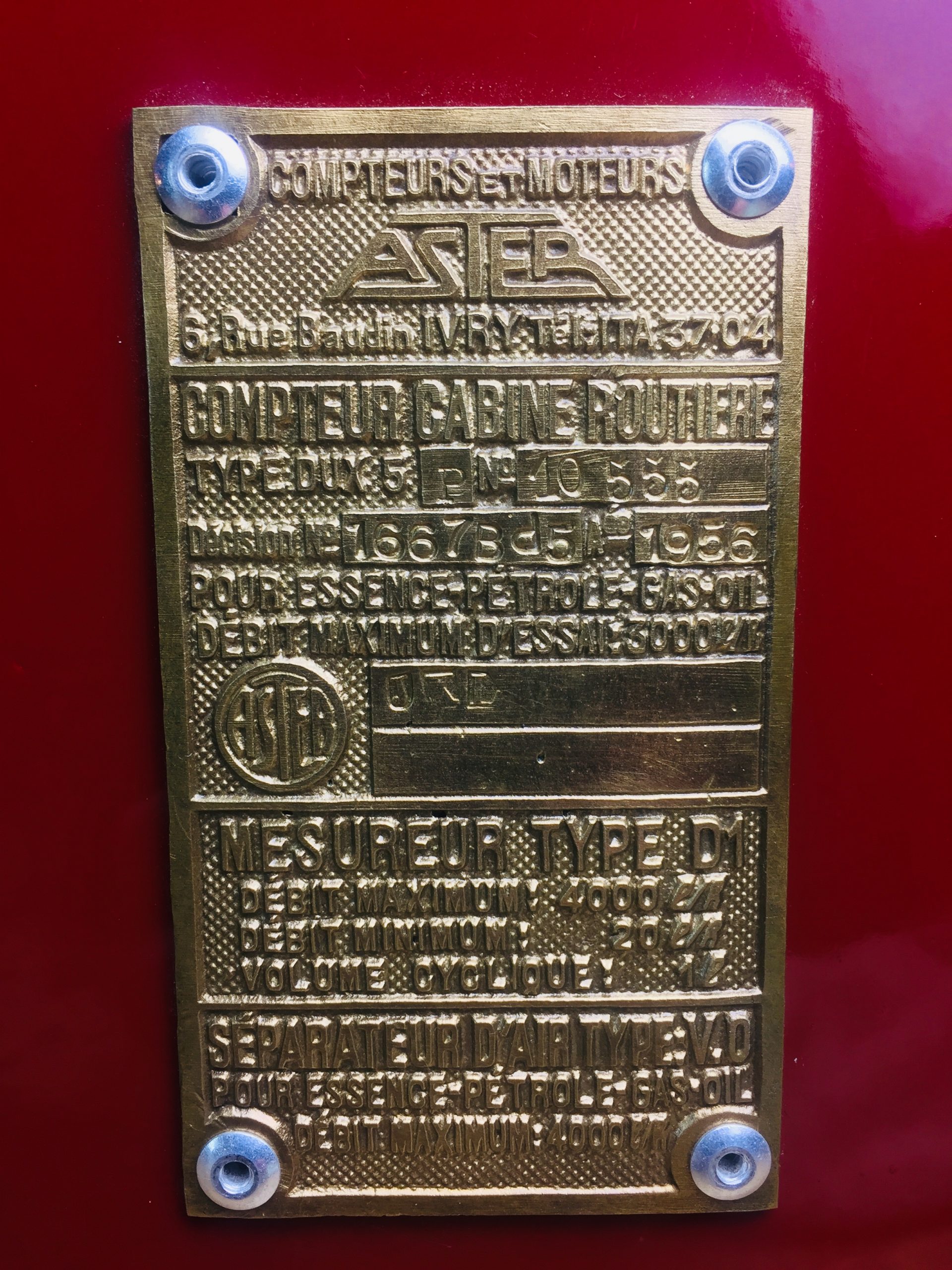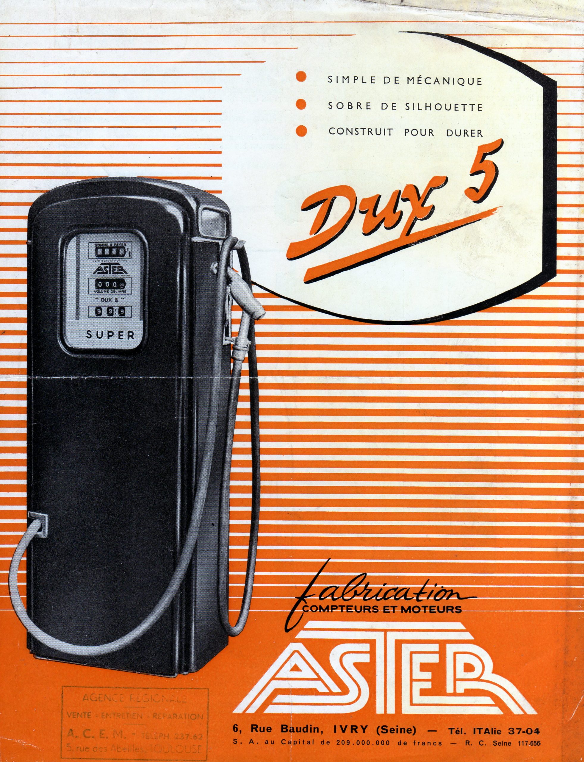 C’est pour les besoins de ces dernières fabrications qu’elle a installé ses usines d’Ivry-sur-Seine où elle construisit toute la gamme des distributeurs d’hydrocarbures en usage, allant des « Dux 5 », distributeurs routiers à compteur continu pour la vente au détail, jusqu’au «Junior », appareil de même type construit spécialement pour les entreprises privées lorsqu’un appareil poinçonné par l’État n’est pas obligatoire. N’oublions pas de mentionner enfin le « Mixer », homologué par le Service des Instruments de Mesure, distributeur mélangeur nouvellement créé en vue du ravitaillement des moteurs « 2 temps », appareil qui a été décrit dans le numéro du 19 janvier [année inconnue] de notre Édition Motocycle.