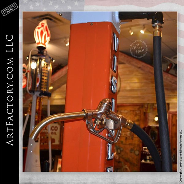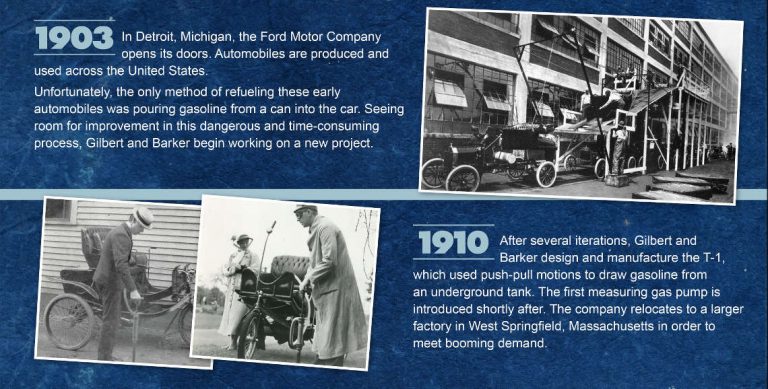 Ce n’est qu’en 1910, soit 26 ans après sont rachat, que Gilbert & Barker conçoit et fabrique sa première pompe à essence, la T-1, qui utilise un mouvement « push-pull » pour extraire l’essence d’un réservoir souterrain servant à faire le plein des automobiles.