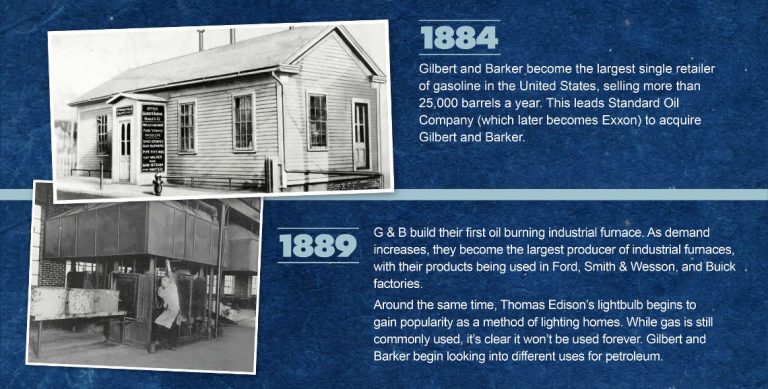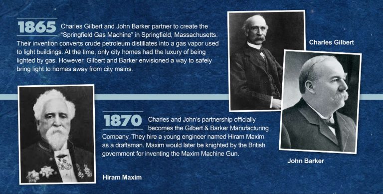 C’est en 1865 que Charles Gilbert et John Barker s’associent pour construire la « machine à gaz Springfield [+] », qui convertissait les distillats de pétrole brut en vapeur de gaz utilisée pour éclairer les bâtiments. Gilbert & Barker fabriquera un peut plus tard des brûleurs à mazout pour les fours industriels [si.edu].