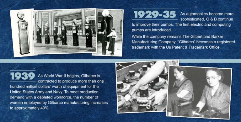 1929 marque un tournant pour l’entreprise. Bien que la société reste la Gilbert & Barker Manufacturing Co., c’est la première fois que l’on parle de « Gilbarco », une marque qui sera déposée auprès du « US Patent & Trademark Office » en 1935.