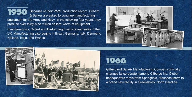 En 1965, Gilbert et Barker Manufacturing Company change officiellement de nom, pour devenir Gilbarco et déménage le siège social et l’usine américaine à Greensboro (Caroline du Nord / USA).