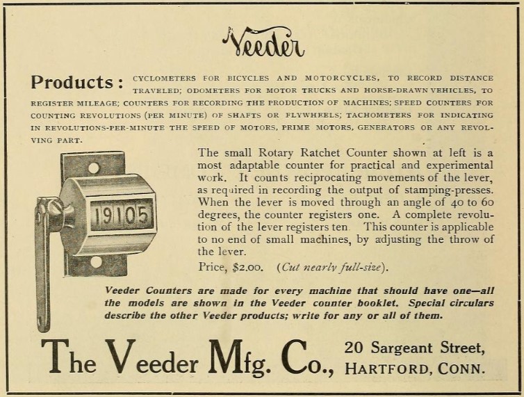 Près de 30 ans plus tard, en 1895, Curtis Veeder, fondateur de la Veeder Manufacturing Company, invente le cyclomètre (l’un des tout premier compteur pour vélo) pour enregistrer les kilomètres parcourus à vélo . Il promu le compteur avec comme slogan « It’s Nice to Know How Far You Go » (« C’est bien de savoir jusqu’où vous allez »). Le succès du cyclomètre a conduit à la création d’une gamme complète d’appareils de comptage Veeder.