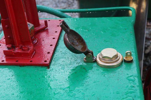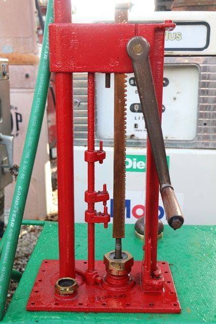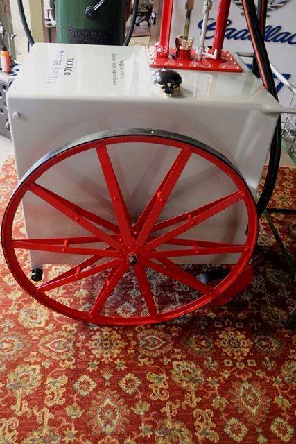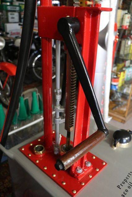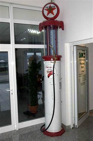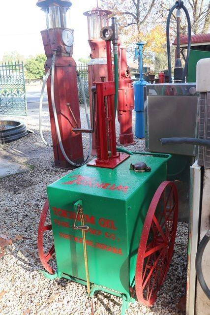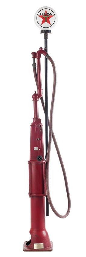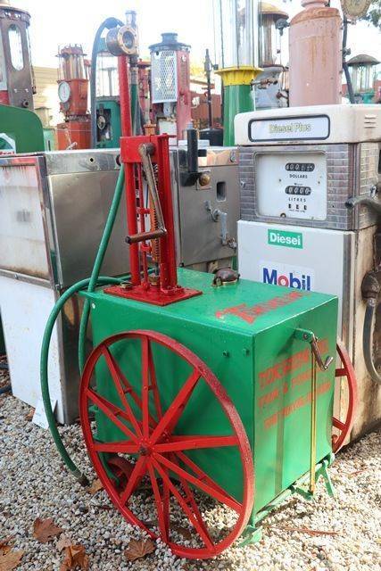L’un des premiers dispositifs pour la distribution de produits pétroliers est cette pompe à huile Tokheim, vers 1901 (inventée en 1898).