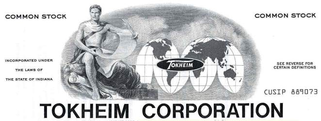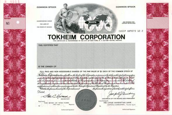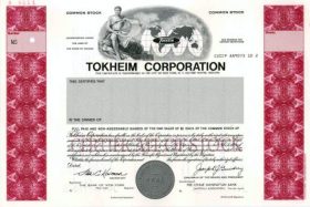 SPECIMEN de certificat magnifiquement gravé de la Tokheim Corporation datant de 1978.