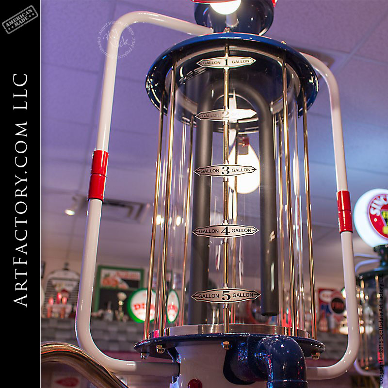 Pompe Fry visible « Mae West », modèle 117R, 1910 (https://mancave.artfactory.com/product/fry-5-gallon-visible-gas-pump/)