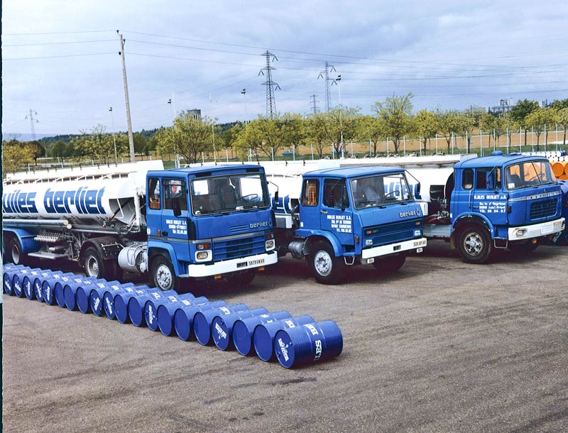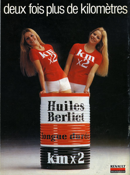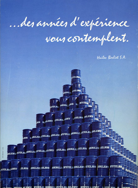 Les années 70 amorcent la fin de la fantaisie : exit les mises en scènes variées ! dans une ambiance monochrome « bleu Berliet », de gros bidons s’empilent afin d’illustrer la force et la stabilité de l’entreprise.