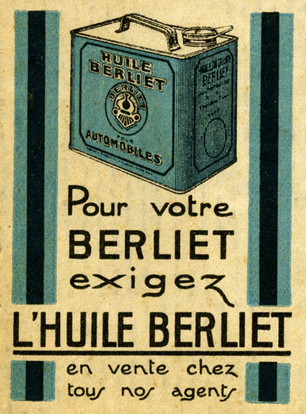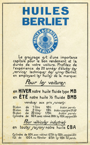 D’abord minimaliste et informative dans les années 20/30, la publicité des Huiles Berliet s’apparente davantage à une fiche technique qu’à un véritable document publicitaire. Le visuel est simple, les prix et caractéristiques des produits sont mentionnés à la manière d’un catalogue.