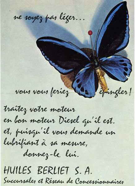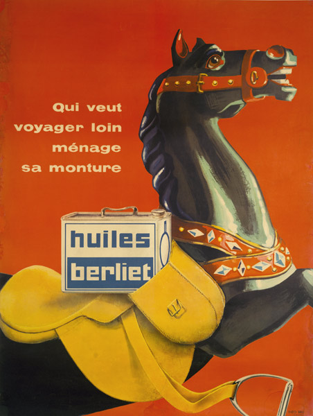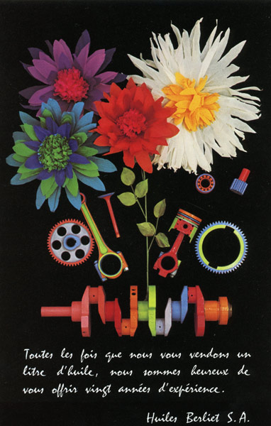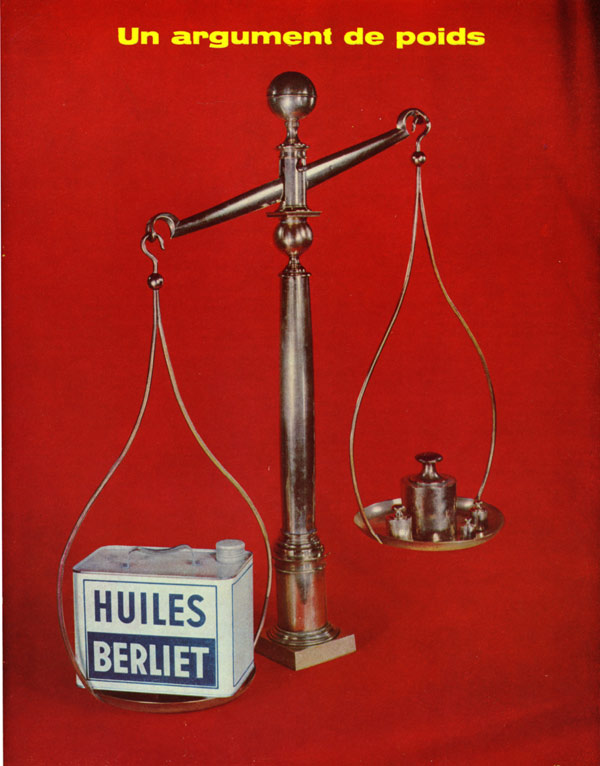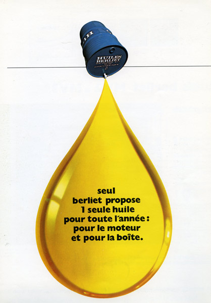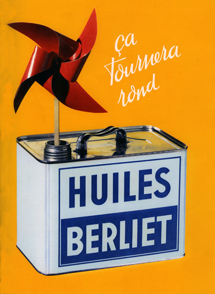 A partir des années 50, l’information écrite s’efface, c’est l’image qui compte ! Les publicités se démarquent par leurs couleurs vives et leurs métaphores cocasses. On remarque une grande créativité et la volonté de viser un large public à travers une communication souvent aux antipodes de la mécanique et du camion. A cette époque, les Huiles Berliet mettent un point d’honneur à ajouter une touche d’humour dans leurs publicités : seule référence au produit, le petit bidon bleu et blanc se fait discret et va même jusqu’à disparaitre de certaines affiches.
