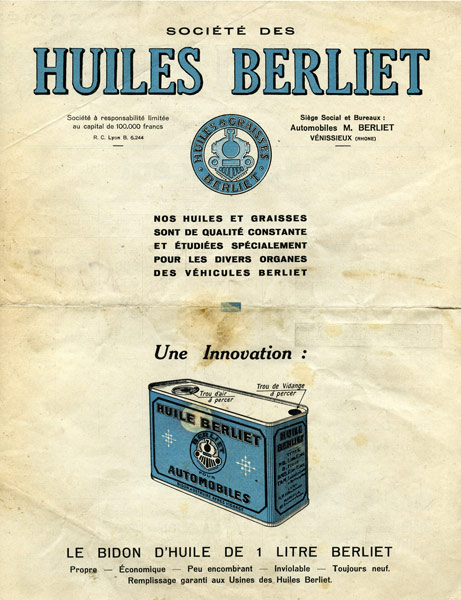 En 1924, trois entrepreneurs comptant parmi eux le fournisseur de graisses et lubrifiants de Marius Berliet s’associent. Un contrat est passé avec Berliet en mars 1926 pour utiliser son réseau commercial et distribuer les produits moyennant une redevance. La toute jeune Société des Huiles Berliet installée à Lyon, est une SARL (Société à responsabilité Limitée). Elle se positionne comme l’un des précurseurs du concept d’huile d’origine (Genuine Oil) et distribue ses produits par l’intermédiaire du réseau Berliet constitué de 14 succursales et 800 concessionnaires En septembre 1927, Marius Berliet prend la majorité des parts de l’entreprise, soit les 3/4 du capital social. Le siège des Huiles Berliet est transféré à Vénissieux, dans les bureaux de l’entreprise Berliet.