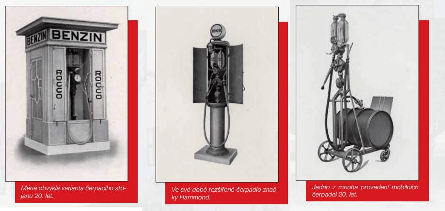Cependant, le nombre de véhicules augmentant et à l’initiative du Club tchèque des motocyclistes, fondé en 1904, dix-sept stations de ravitaillement furent construites dans des hôtels, des pharmacies et des magasins, où l’essence est vendue dans des bonbonnes en verre, qui ont rapidement été remplacées par des fûts munis de pompe à main.