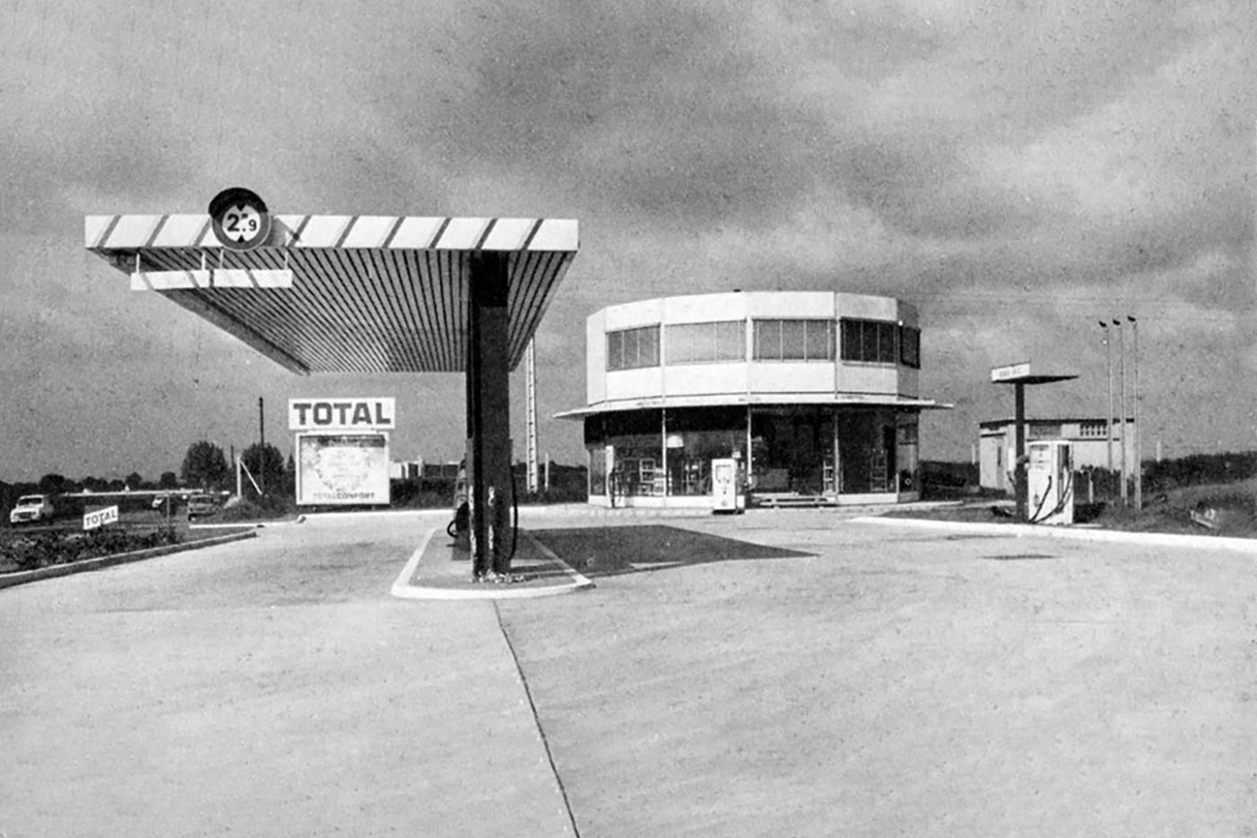 A partir de 1969, l’entreprise énergétique Total développe une politique d’aménagements industrialisés de ses stations essence, qu’il s’agisse de ses grandes stations d’autoroute ou de ses stations routières. Elle souhaite une image de marque qui la ferait se différencier radicalement de ses concurrents.