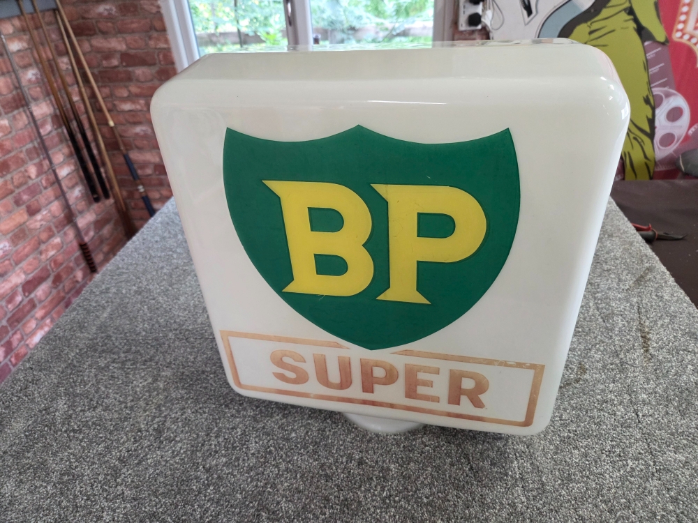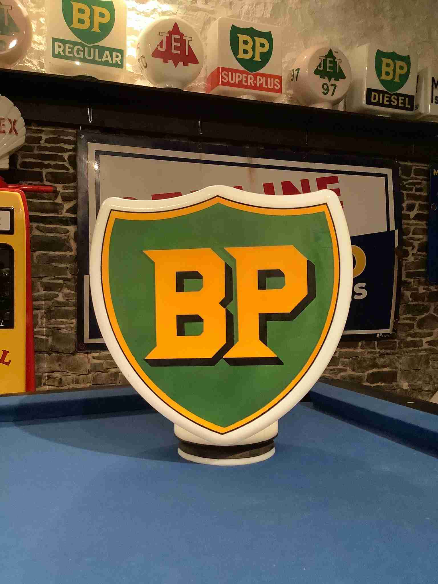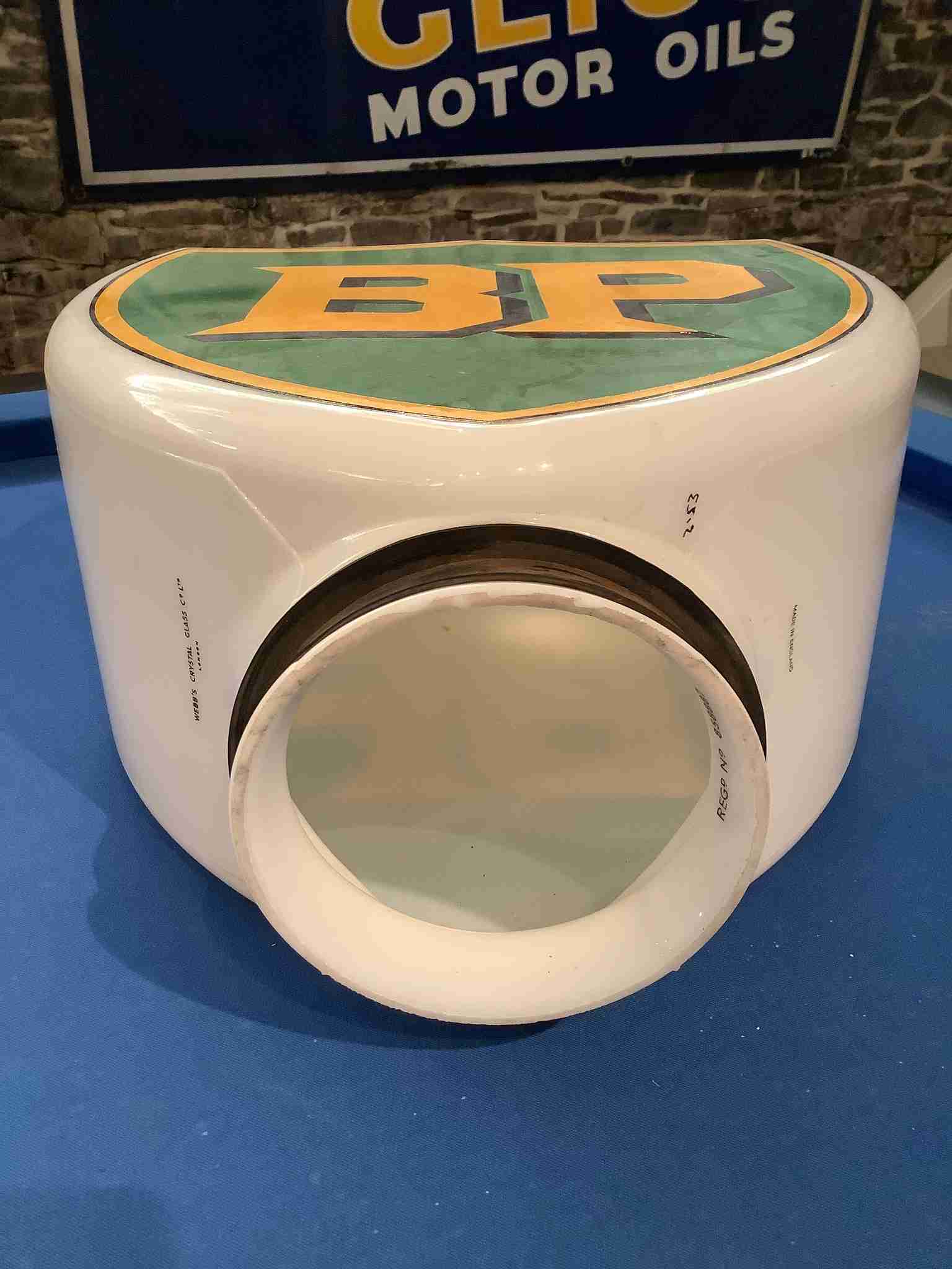 Globe original de pompe à essence BP. Il s’agit d’un superbe objet qui était installé au sommet d’une pompe à essence dans la région de Brighton dans les années 1960. Sans aucune fissure ni dommage, c’est un objet exceptionnel. Il présente une entaille au niveau du col pour permettre le passage d’un câble afin de l’éclairer à l’aide d’une ampoule, mais il s’agit d’une entaille artificielle et NON d’un dommage.