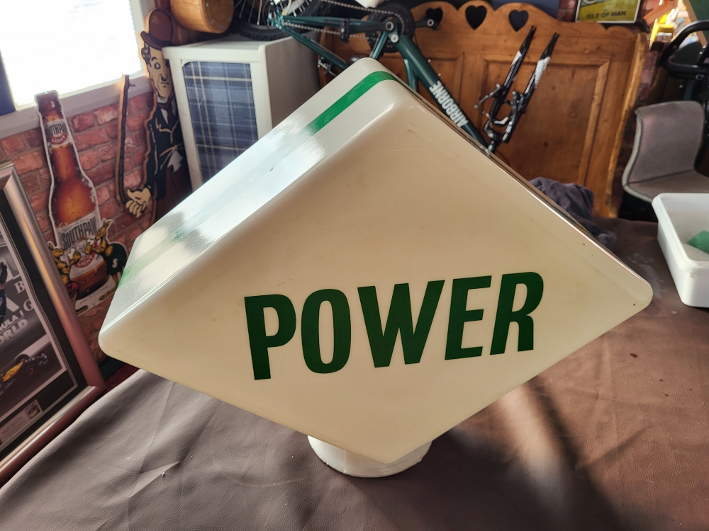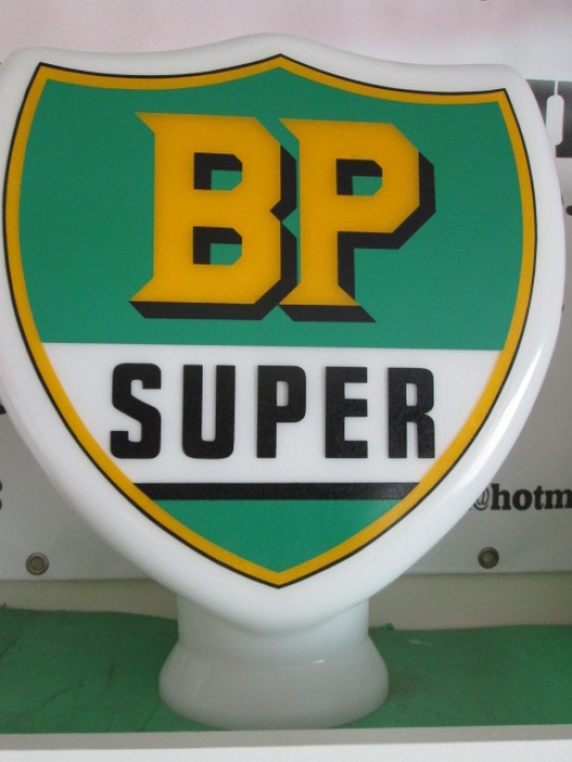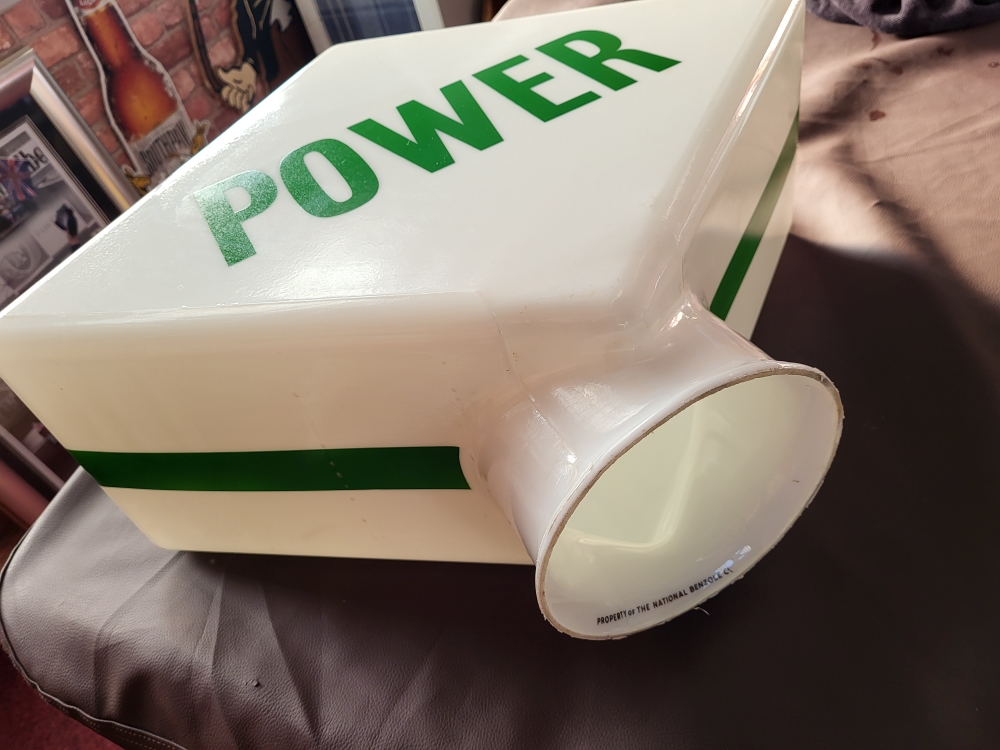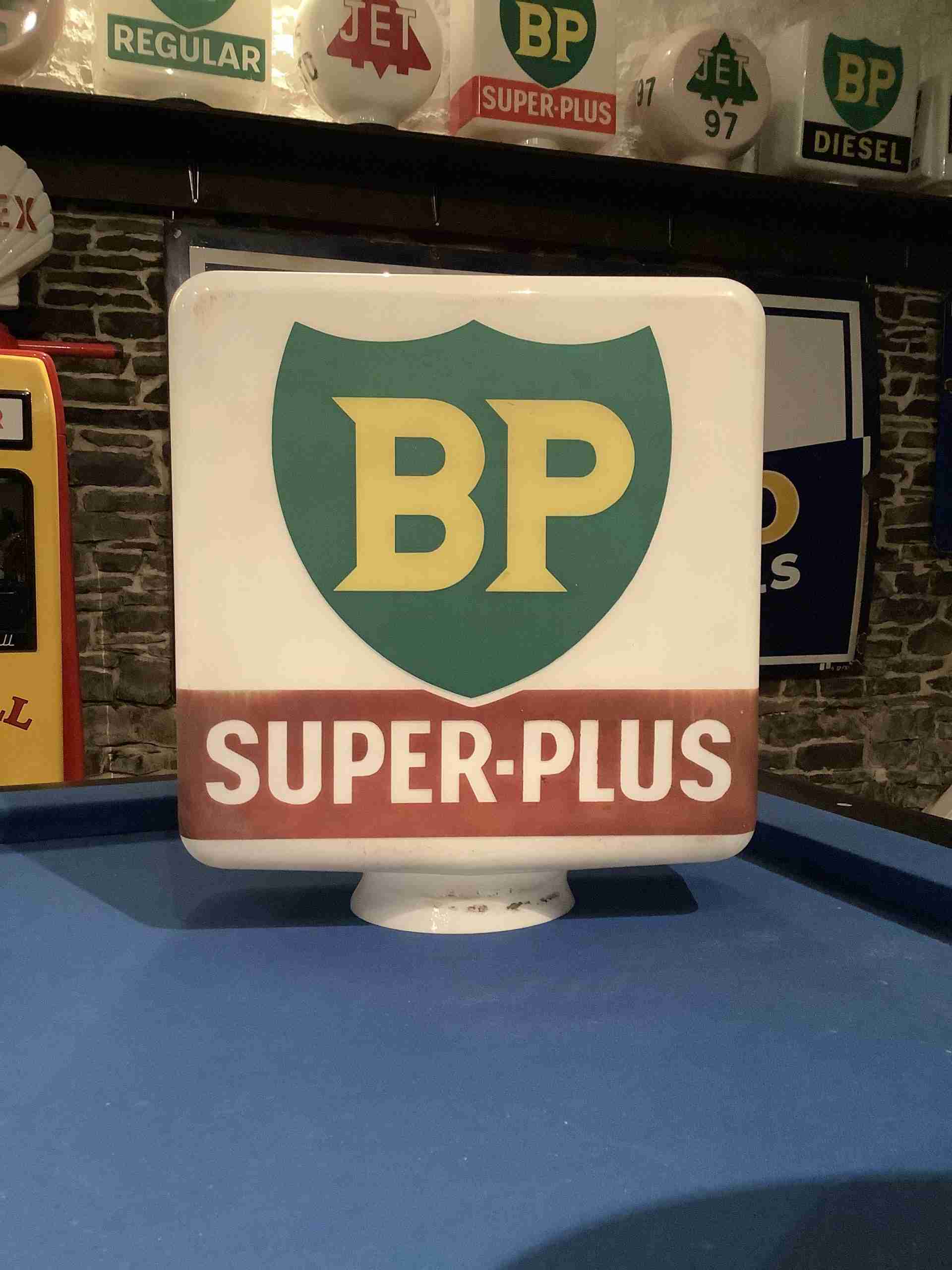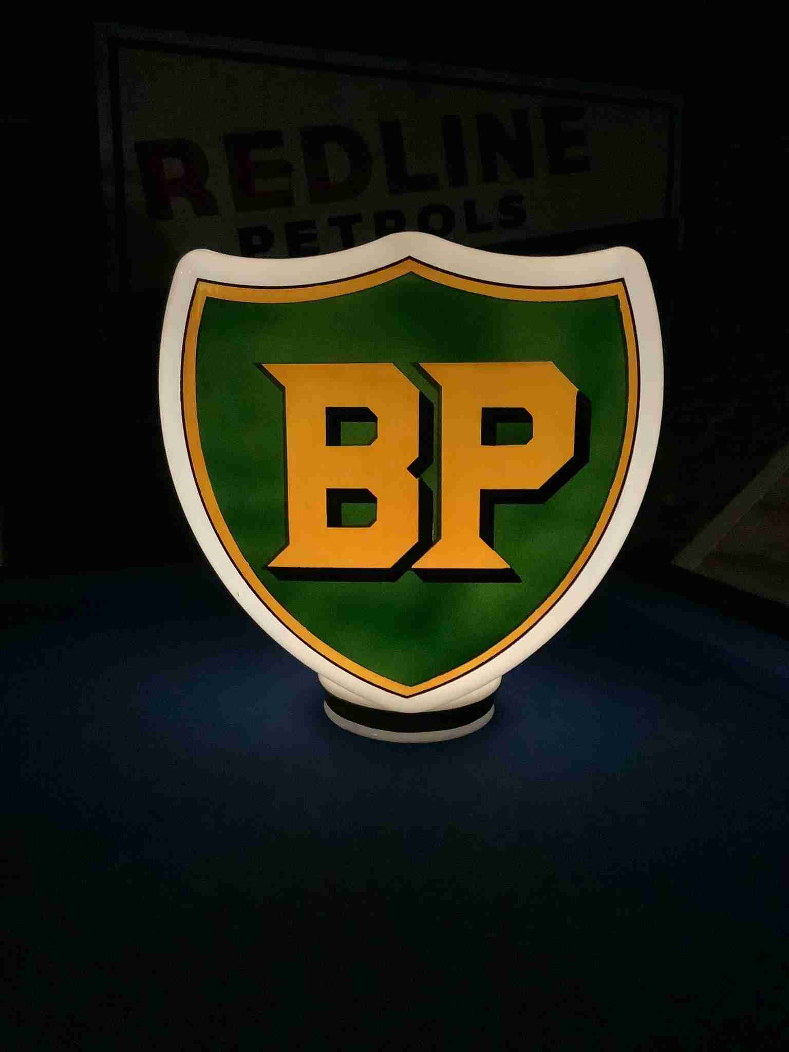 Globe original de pompe à essence BP. Il s’agit d’un superbe objet qui était installé au sommet d’une pompe à essence dans la région de Brighton dans les années 1960. Sans aucune fissure ni dommage, c’est un objet exceptionnel. Il présente une entaille au niveau du col pour permettre le passage d’un câble afin de l’éclairer à l’aide d’une ampoule, mais il s’agit d’une entaille artificielle et NON d’un dommage.