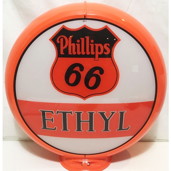 Globe de pompe à essence Phillips 66 Ethyl (version 2) avec le célèbre logo à placer sur le dessus d’une pompe à essence. Lentilles en verre avec corps en plastique. Le globe est double face.