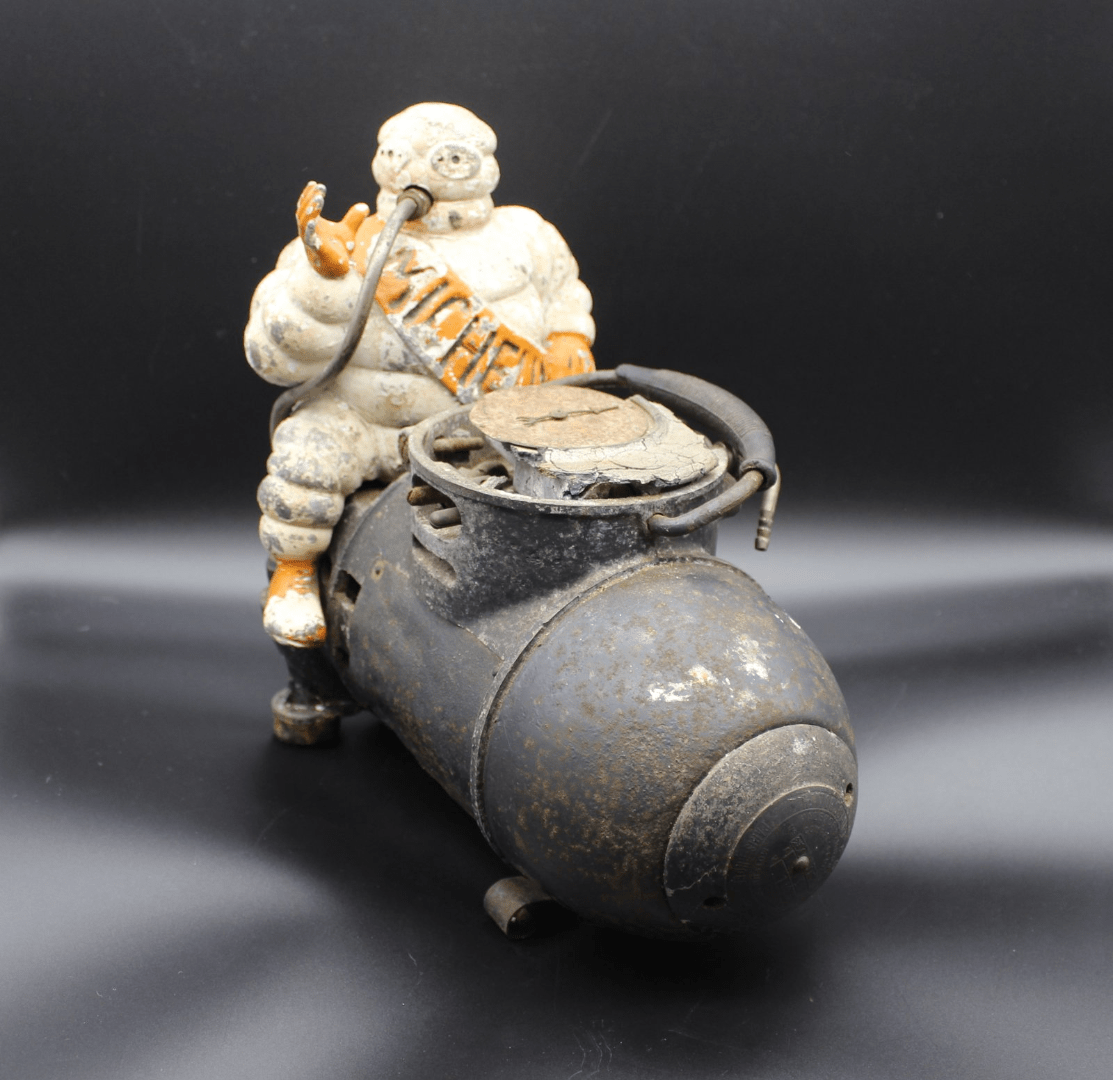 Se fixait sur un socle à l’aide d’un rivet. L’ensemble comprenait la pompe bleue, la pompe rouge et un gonfleur.