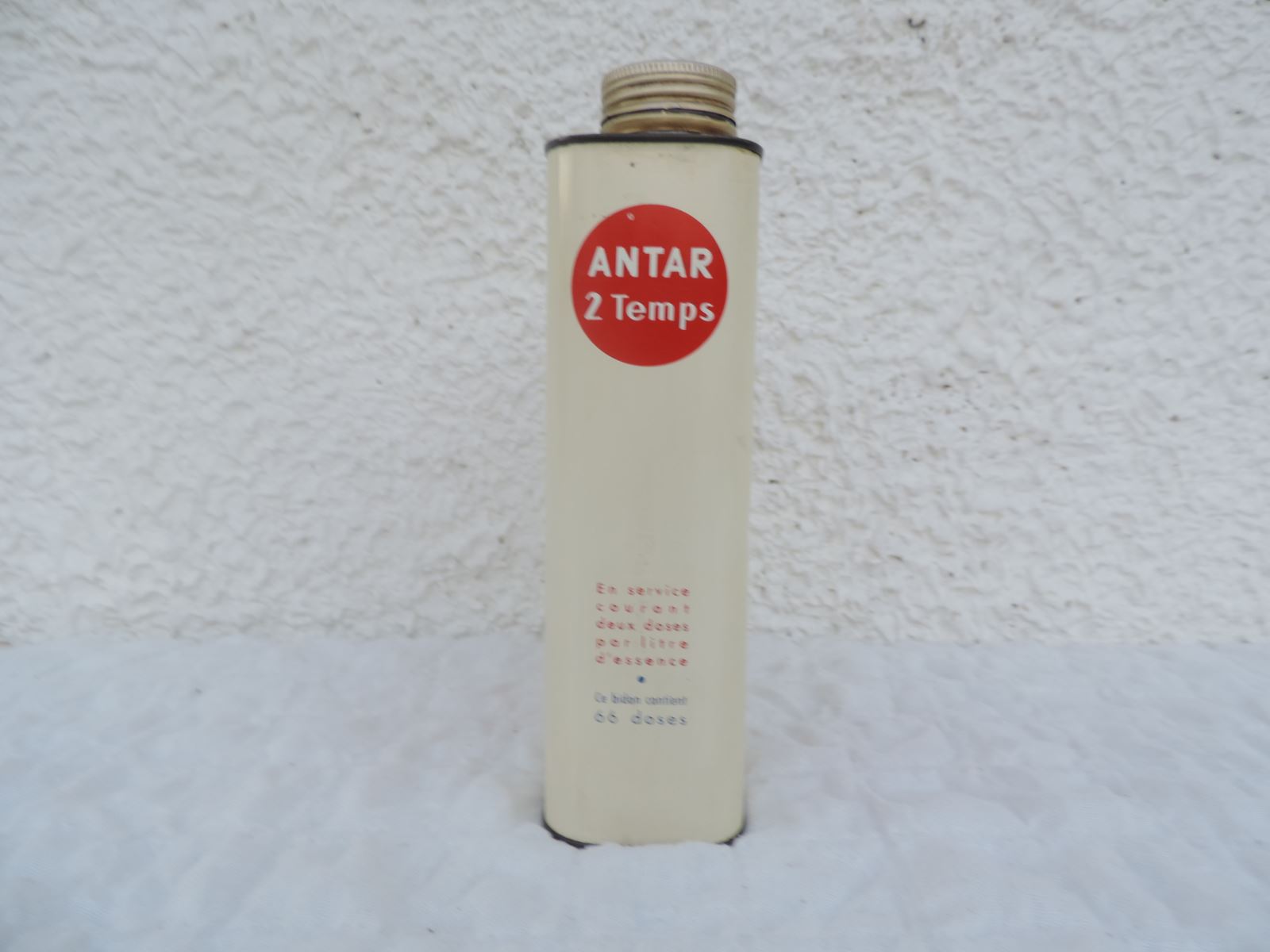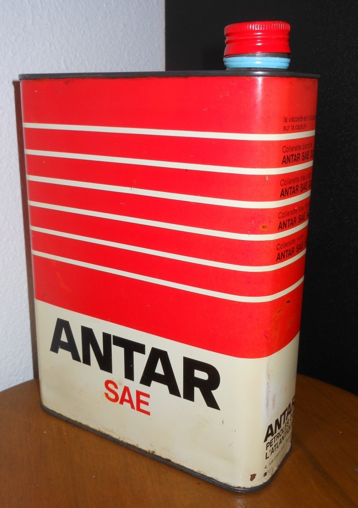 Précisions inscriptions : « ANTAR L’HUILE DE FRANCE » (sur les deux grands côtés), « EXIGEZ UN BOUCHON-CAPSULE INTACT ANTAR PETROLES DE L’ATLANTIQUE 4, rue Léon-Jost Paris 17è » (sur un petit côté), « L’indication de viscosité de l’huile contenue dans ce bidon figure sur le bouchon-capsule. Elle est également repérable par la couleur de la collerette restant fixée au goulot après enlèvement du bouchon. – Collerette blanche Antar SAE 20. – Collerette bleue foncé Antar SAE 30. – Collerette rouge Antar SAE 40. – Collerette noire Antar SAE 50. – 3022 BI S » (sur autre petit côté), « BIDON NON REPRIS » (au-dessus), « ANTAR SAE 20 » (sur couvercle).