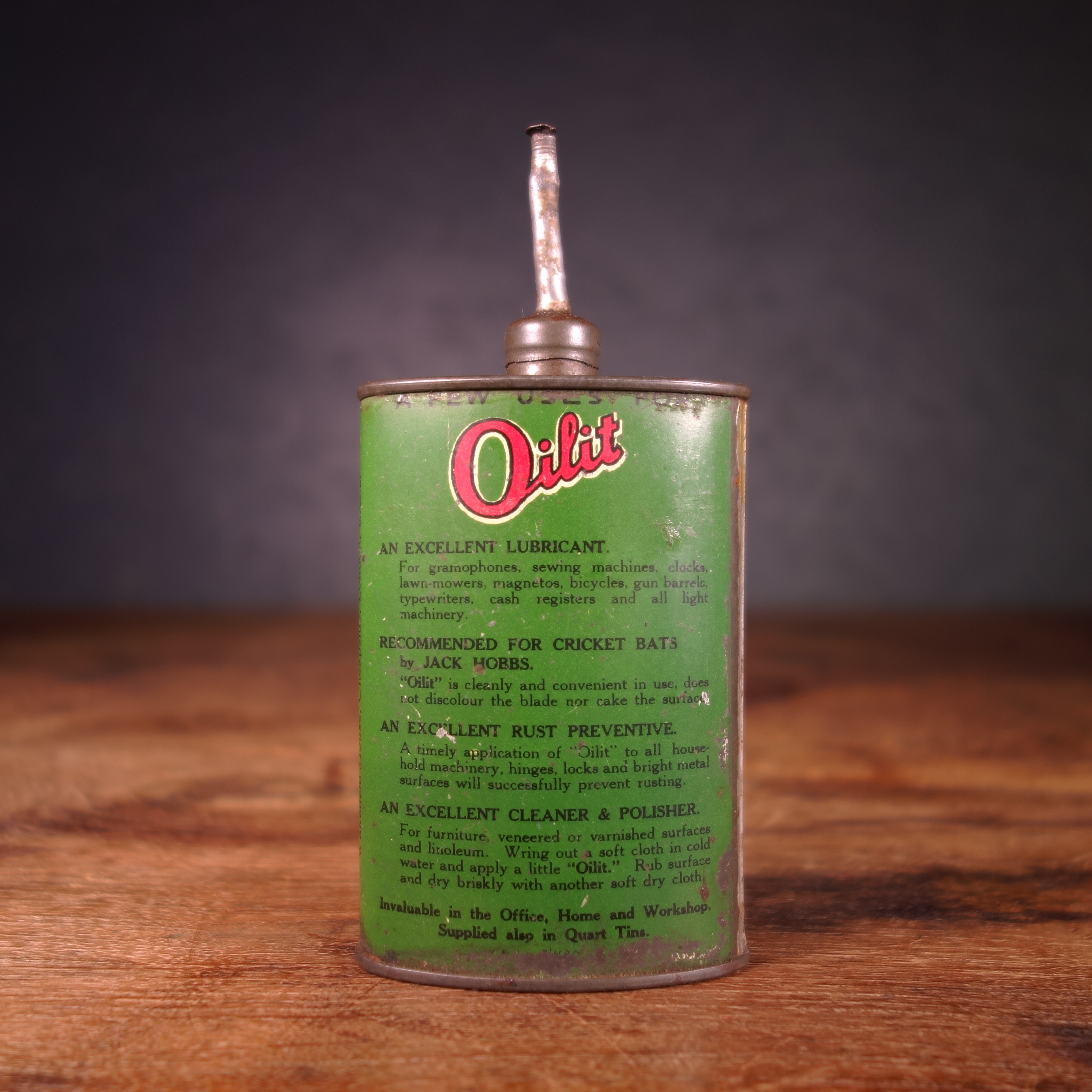 - Ce bidon d’huile lubrifiante pour cycle « Wakefield Oilit » est d’un beau rouge et vert ;