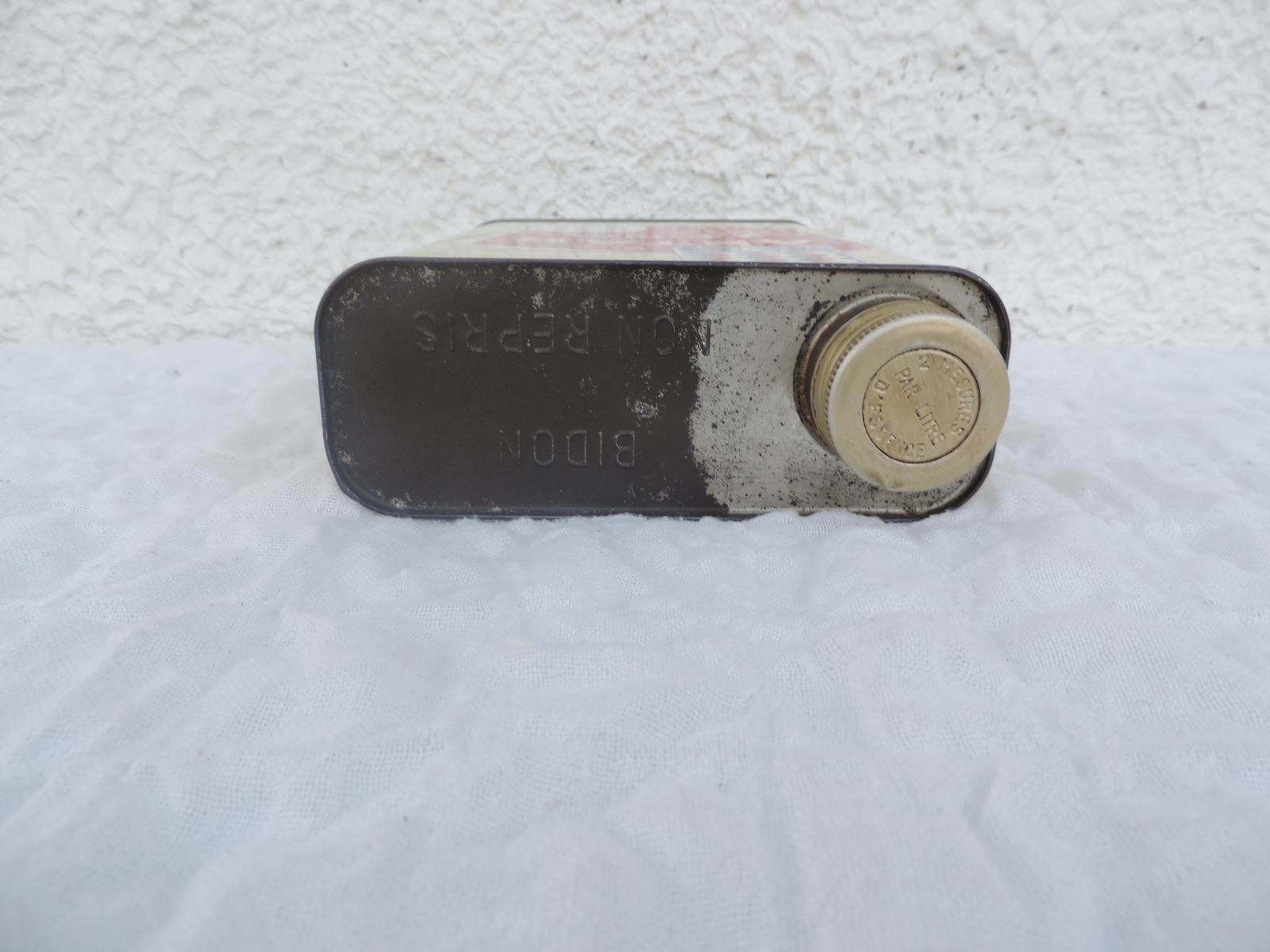 Précisions inscriptions : ANTAR – L’HUILE DE FRANCE – LE PETROLE DE PECHELBRONN (sur les 2 grands côtés); EXIGEZ UN BOUCHON-CAPSULE INTACT. ANTAR Société Anonyme d’Exploitations Pétrolières 4, R. Léon-Jost PARIS (sur petit côté)