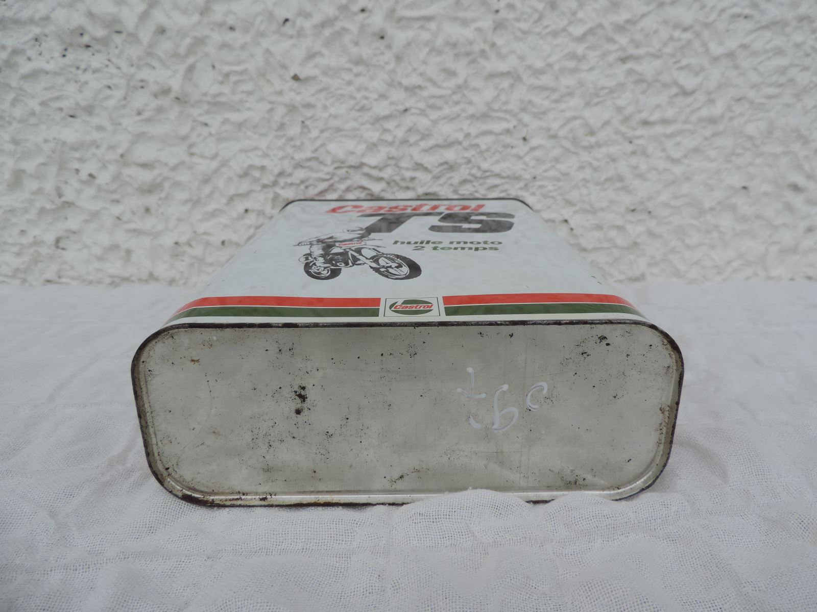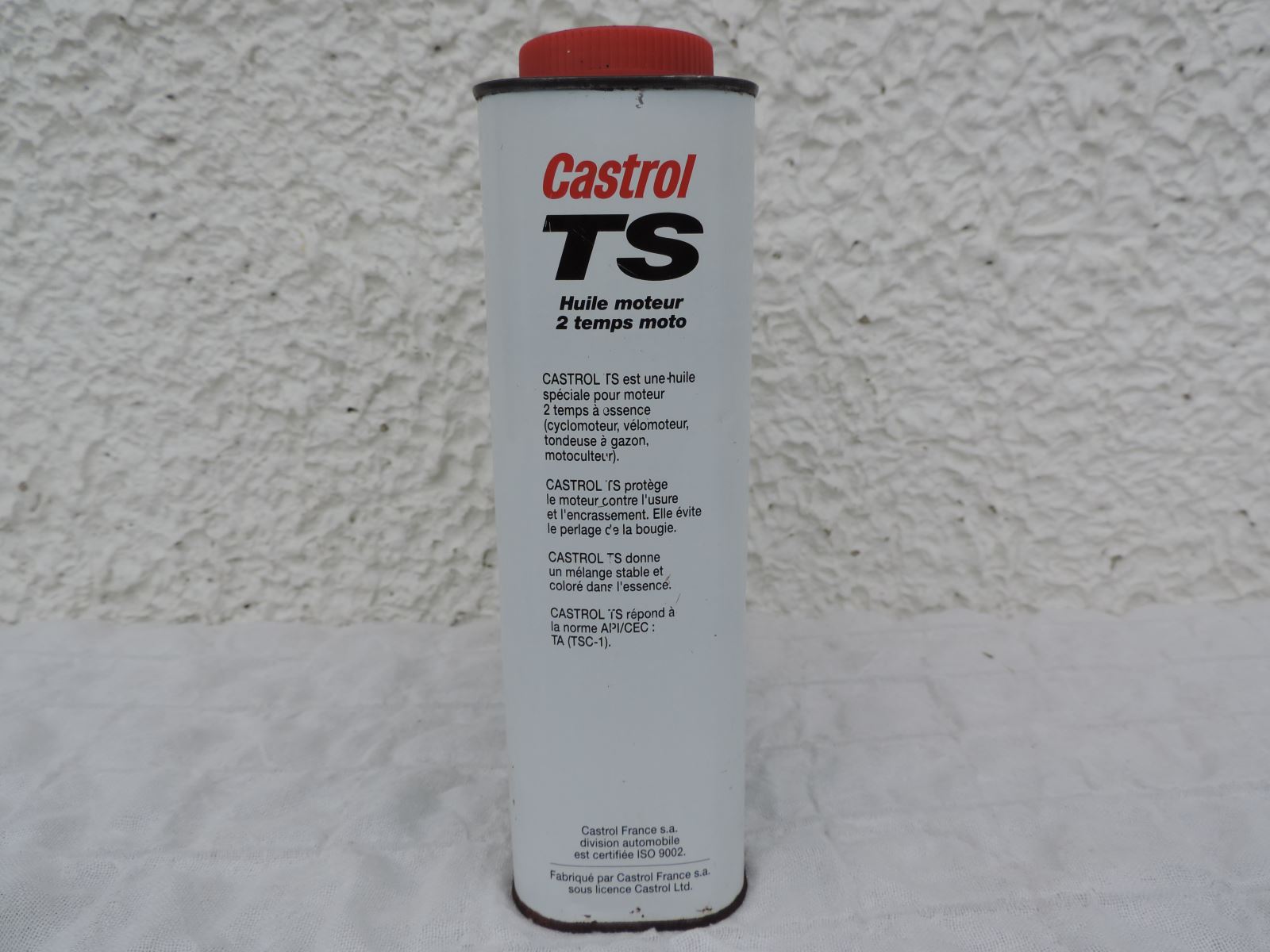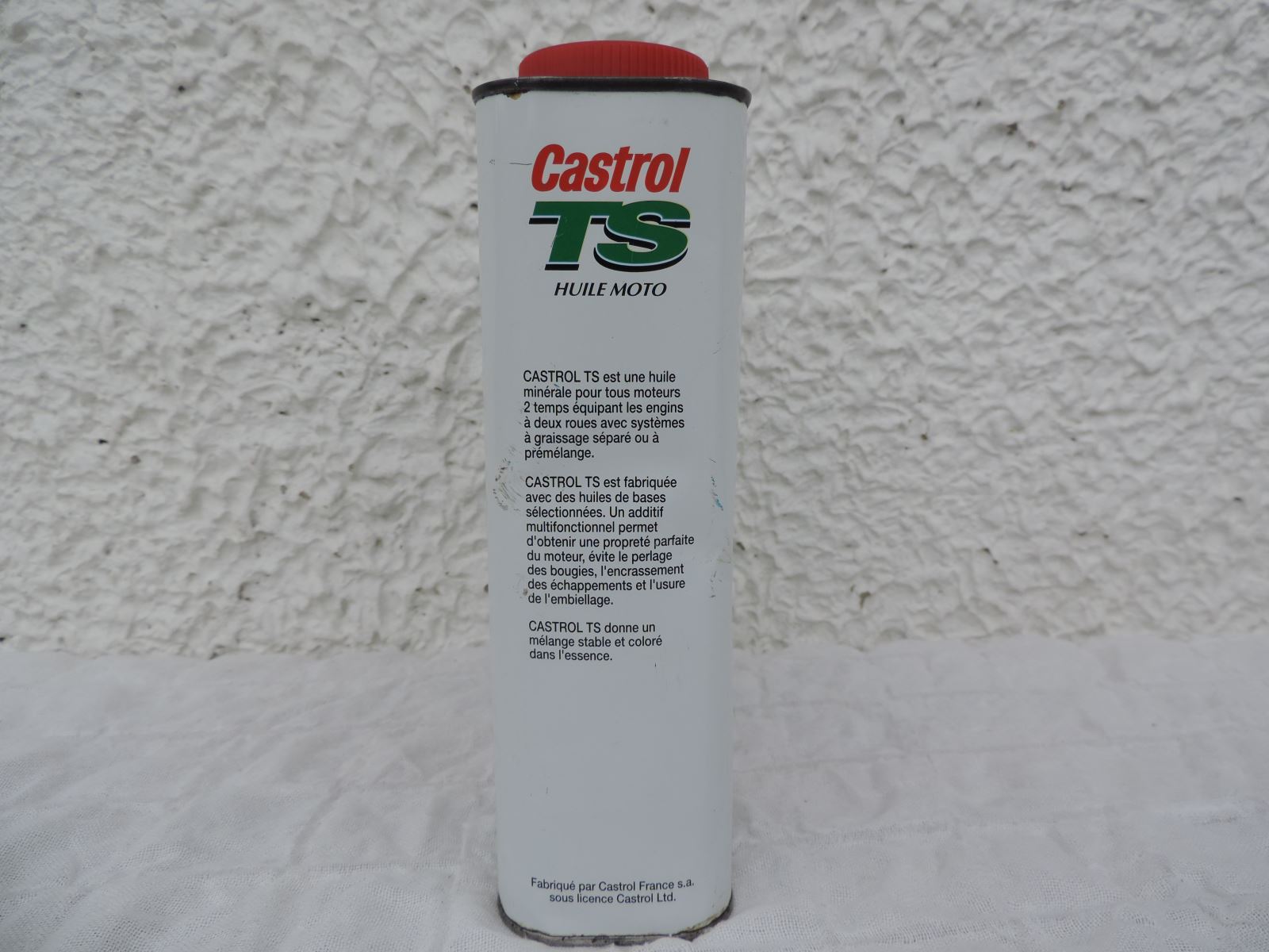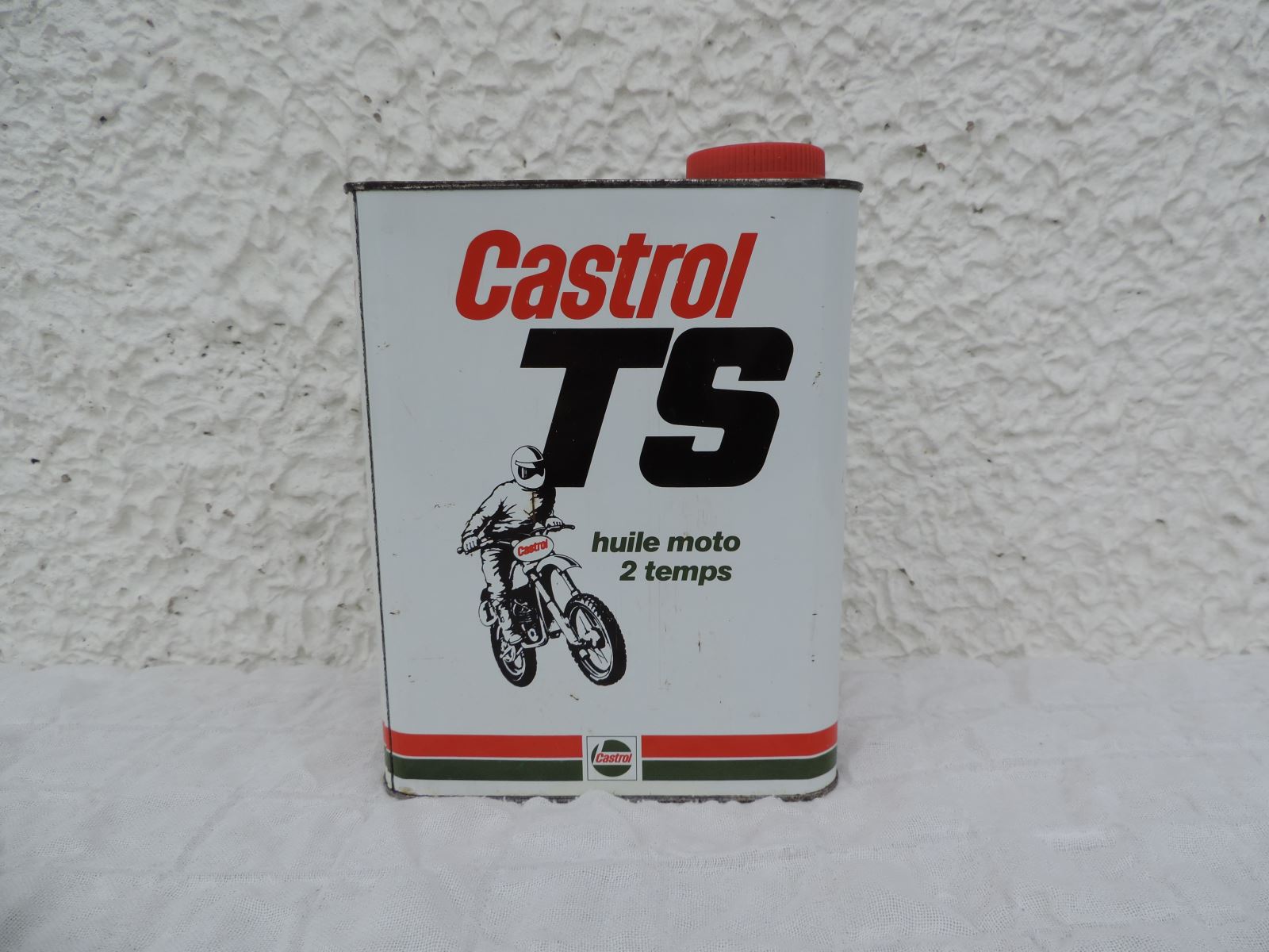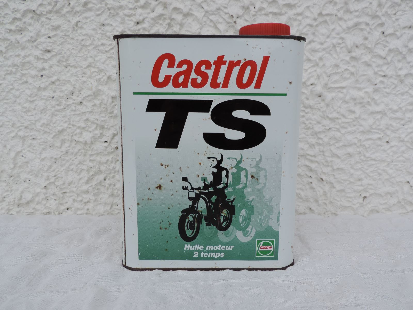 Second bidon CASTROL « TS », avec moto et ombre.